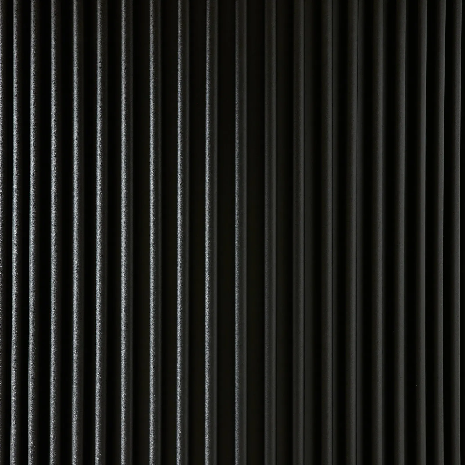 A fluted matte black pedestal base brings architectural depth while maximising legroom. Brushed brass accents frame the top and base, adding a polished contrast to the monochrome palette.