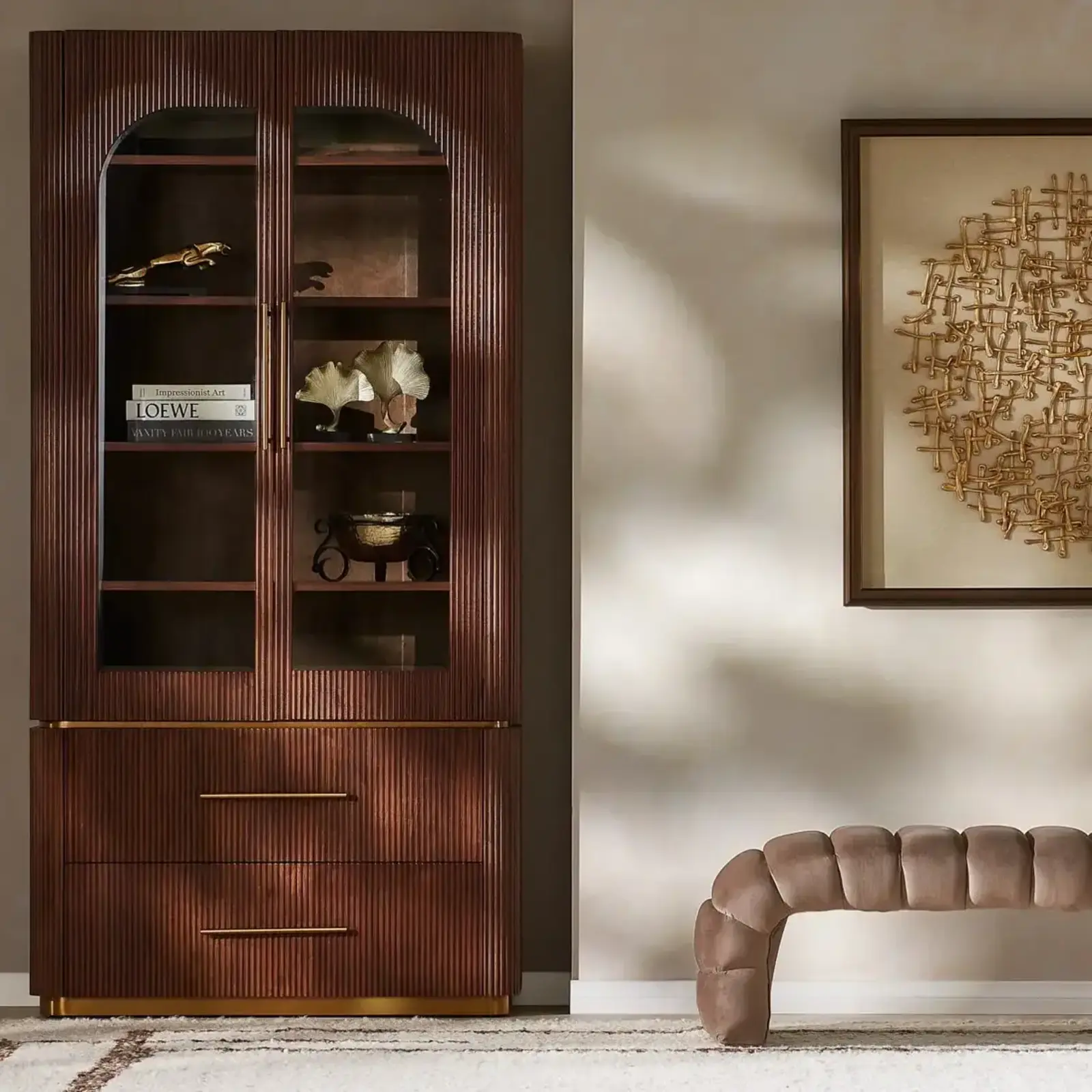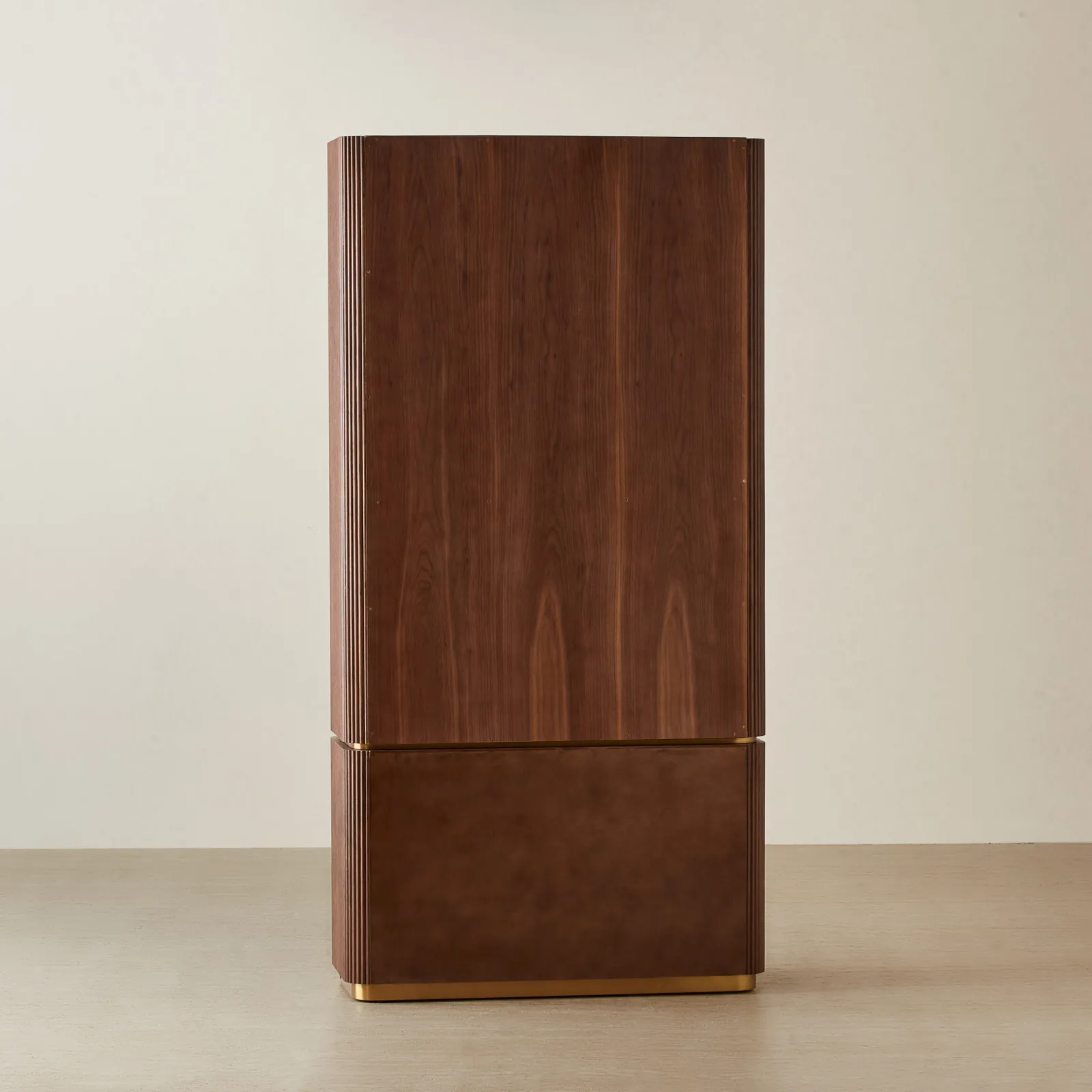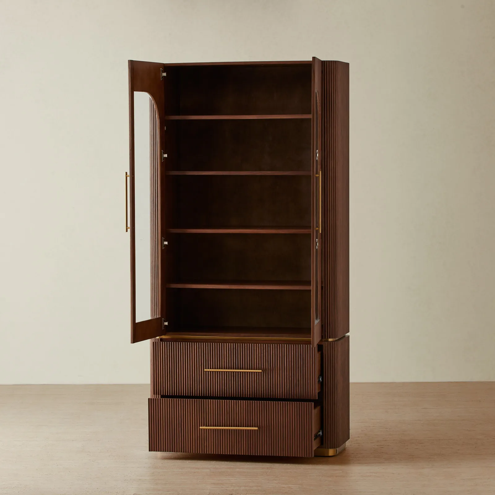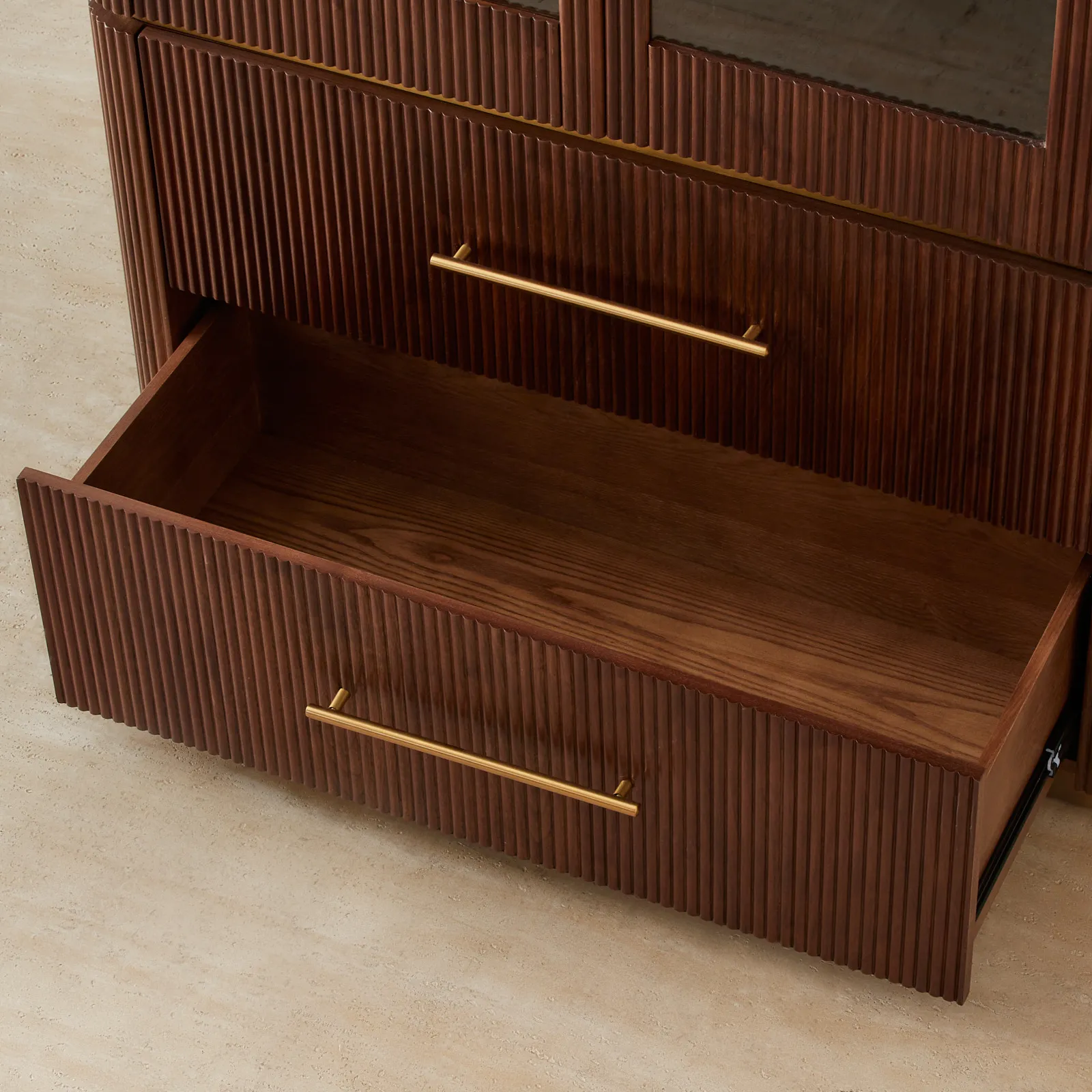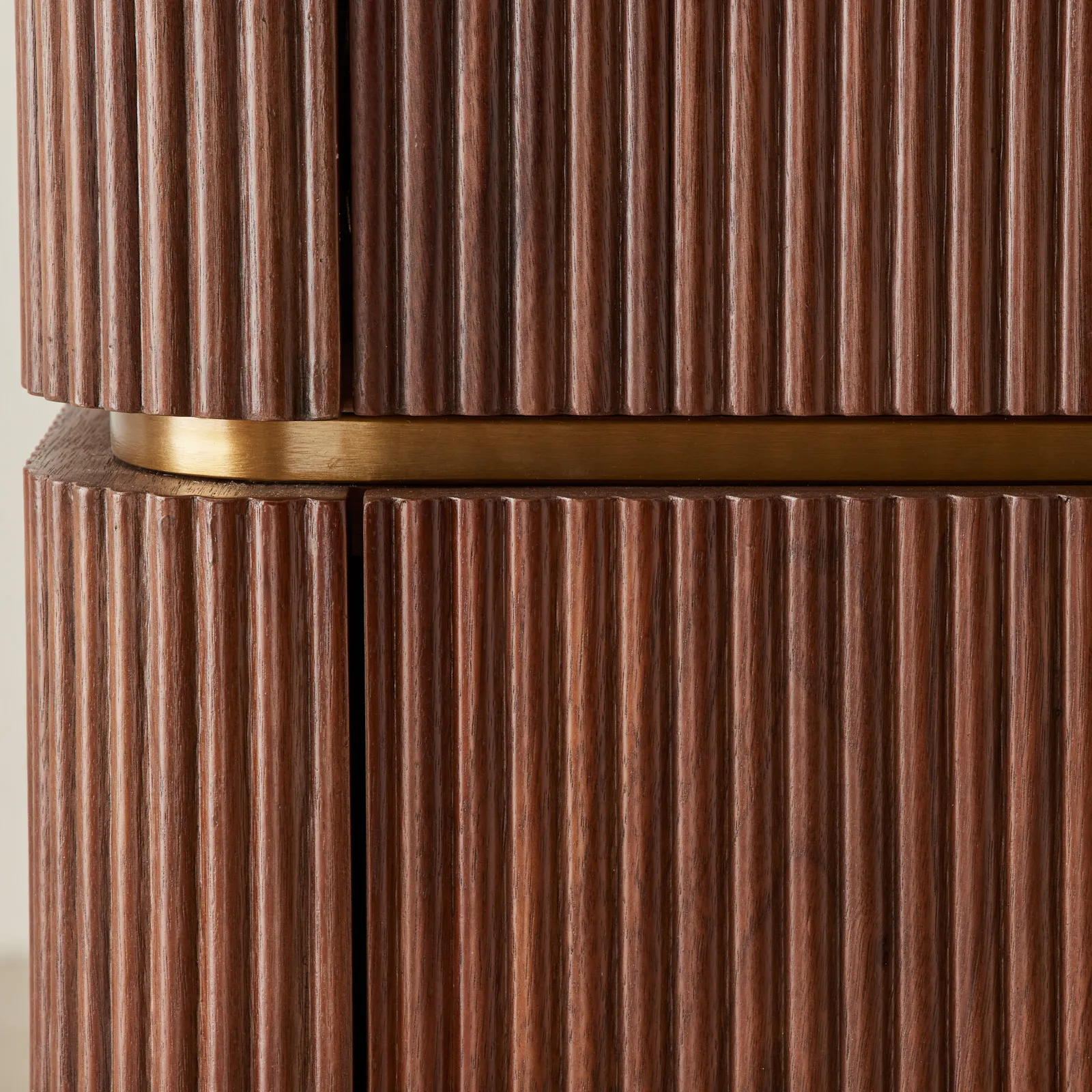 Vertical reeding adds rhythm to the design, giving the wood a rich, sculpted presence. Below, two deep drawers with brass handles provide a sleek, hidden space for everyday essentials.